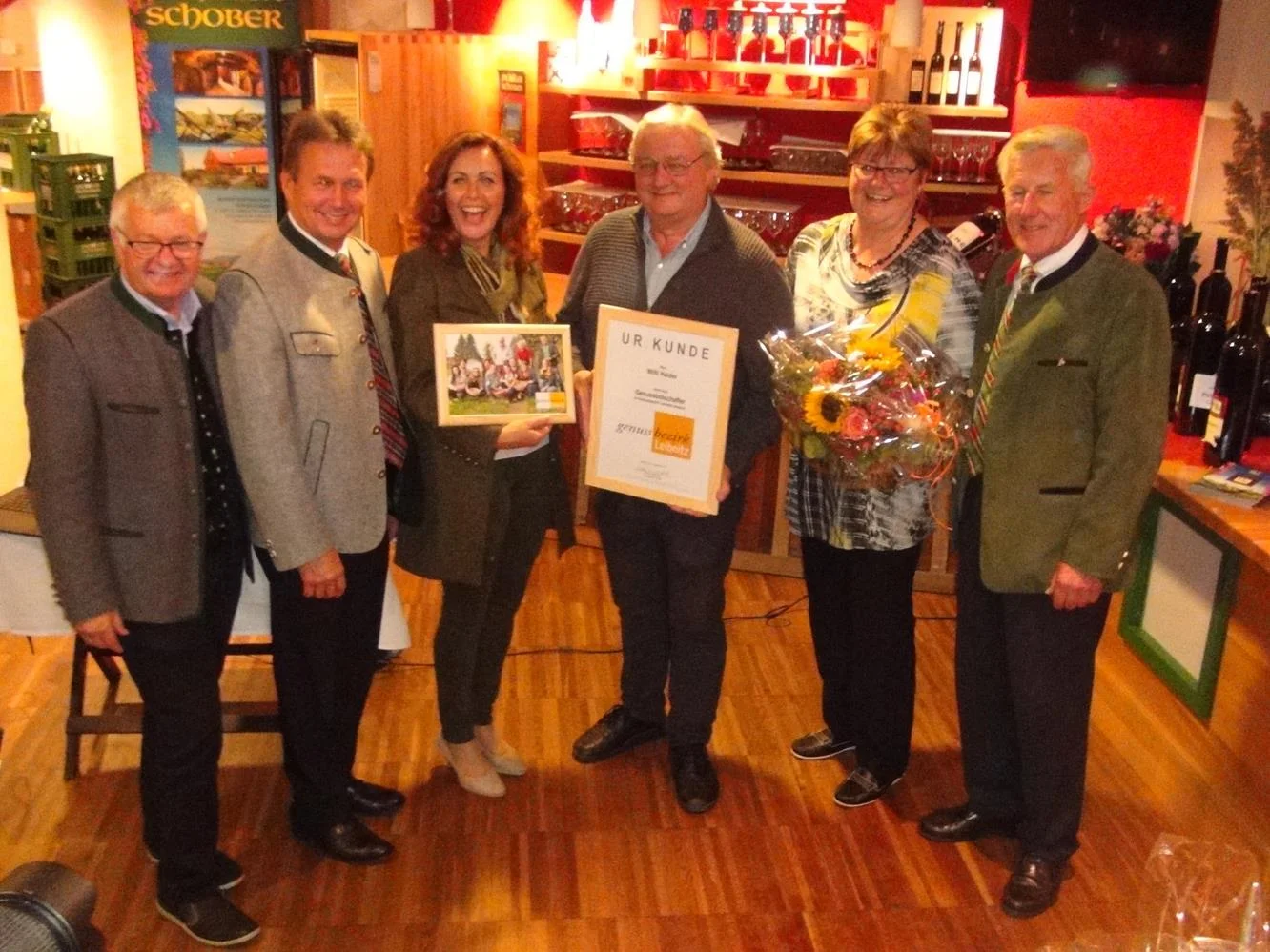Willi Haider (im Bild mit Gattin Renate) ist nun offizieller Genussbotschafter des Genussbezirkes Leibnitz. Dazu gratulieren (v.l.) Dir. Gumpl, Präsident Titschenbacher, Dir. Walch und Obmann Kowald. WOCHE Leibnitz/Heribert Kindermann